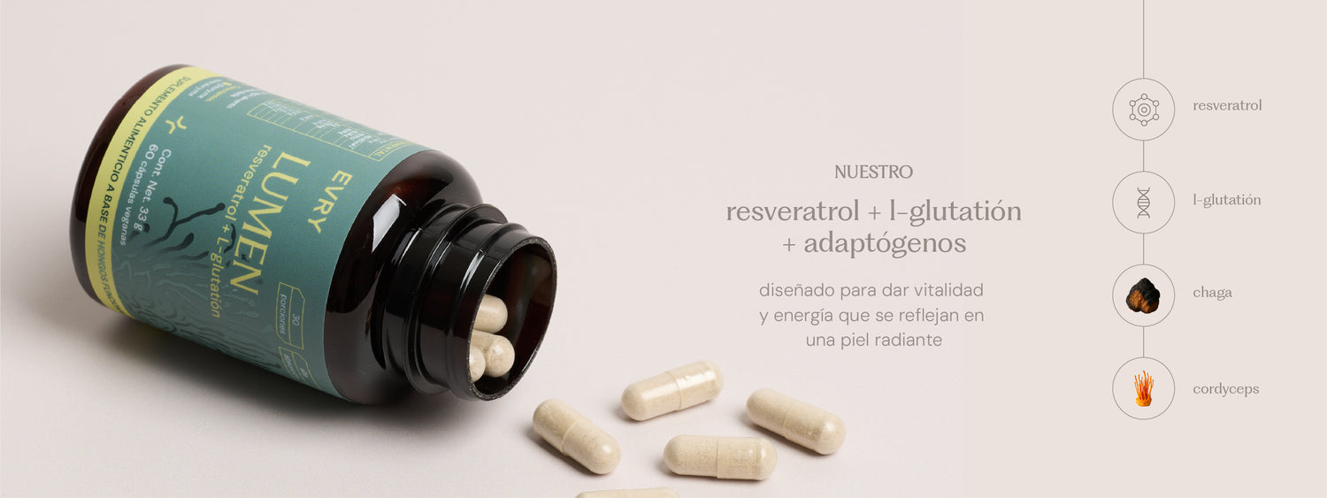 Nuestro suplemento LUMEN combina resveratrol, L-glutatión y extractos de hongos para promover la regeneración celular, proteger contra el estrés oxidativo y mantener tu energía y vitalidad desde adentro.