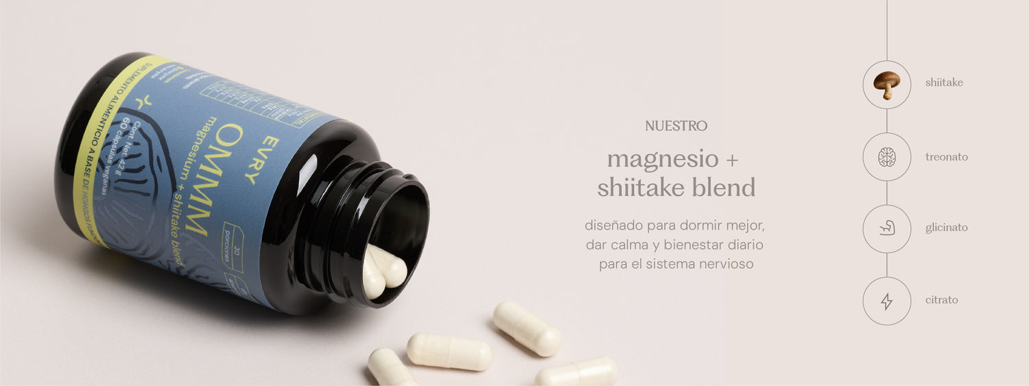 Nuestro suplemento OMMM favorece la relajación física y mental, ayuda a conciliar el sueño y reduce el estrés acumulado del día. Su mezcla de magnesio y extracto de shiitake promueve un descanso profundo y la recuperación natural del cuerpo.